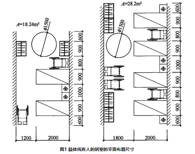 肢体残疾人的居室由于需要设置放置轮椅的位置以及轮椅回转空间,所以面积宜适当放大,放大系数建议设为1.15~1.40,具体见图1。