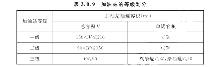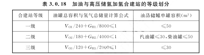 注:1 VO1、VO2、VO3分别为一、二、三级合建站中油品储罐总容积(m³);VLNG1、VLNG2、VLNG3分别为一、二、三级合建站中LNG储罐总容积(m³)。“/”为除号。 2 柴油罐容积可折半计入油罐总容积。 3 当油罐总容积大于90m³时,油罐单罐容积不应大于50m³;当油罐总容积小于或等于90m³时,汽油罐单罐容积不应大于30m³,柴油罐单罐容积不应大于50m³。 4 LNG储罐单罐容积不应天于60m³。3.0.18 加油与高压储氢加氢合建站的等级划分应符合表3.0.18的规定。