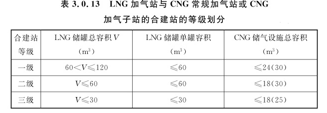 注:带“*”的加气站专指CNG常规加气站以LNG储罐作补充气源的建站形式。3.0.13 LNG加气站与CNG常规加气站或CNG加气子站的合建站的等级划分,应符合表3.0.13的规定。
