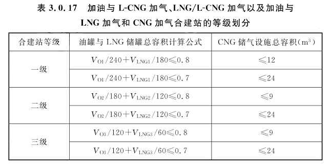 3.0.17 加油与L-CNG加气、LNG/L-CNG加气以及加油与LNG加气和CNG加气合建站的等级划分,应符合表3.0.17的规定。