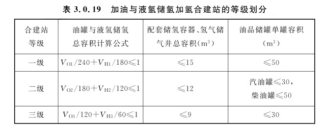 注:1 VO1、VO2、VO3分别为一、二、三级合建站中油品储罐总容积(m³);GH1、GH2、GH3分别为一、二、三级合建站中氢气的总储量(kg)。“/”为除号。 2 柴油罐容积可折半计入油罐总容积。 3 储氢总量包含作为站内储氢容器使用的氢气长管拖车或管束式集装箱储氢量。 4 氢气储量计算基于20℃温度和储氢容器的额定工作压力。3.0.19 加油与液氢储氢加氢合建站的等级划分应符合表3.0.19的规定。