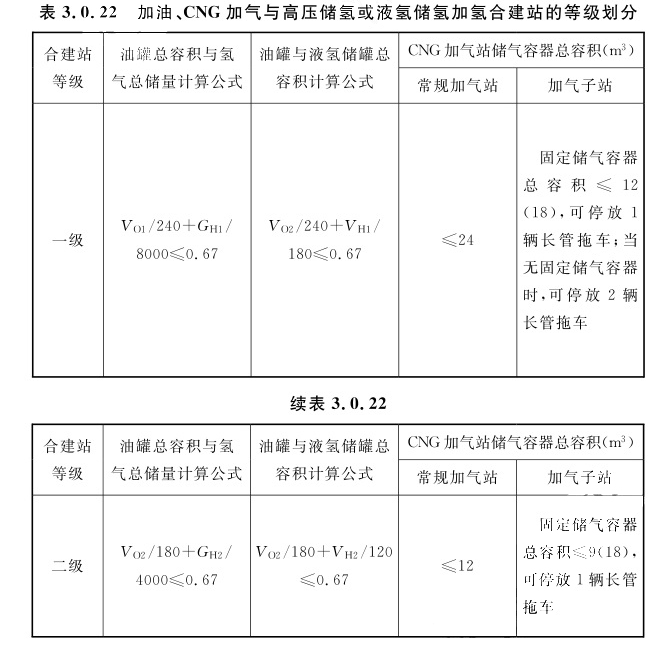 2 表中LNG加气站包括L-CNG加气站、LNG/L-CNG加气站,LNG储罐和液氢储罐单罐容积应小于或等于60m³。 3 储氢总量包含作为站内储氢容器使用的氢气长管拖车或管束式集装箱储氢量。3.0.22 加油、CNG加气与高压储氢或液氢储氢加氢合建站的等级划分,应符合表3.0.22的规定。