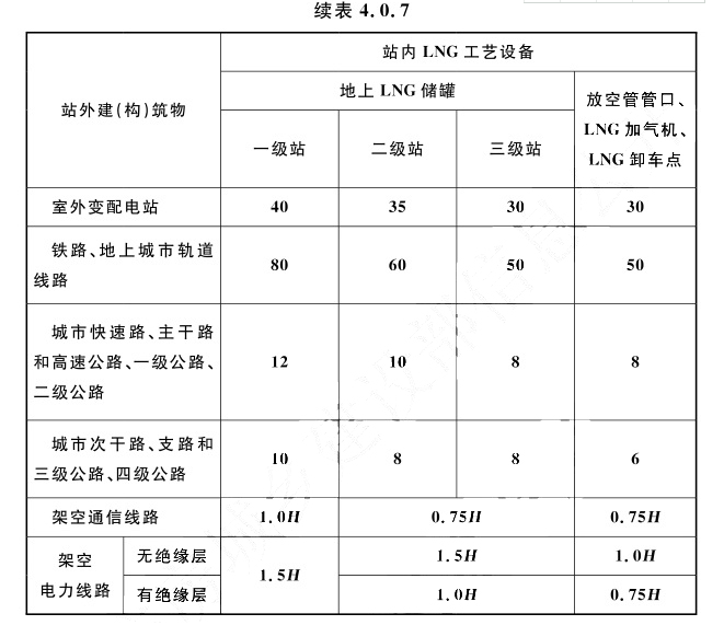 注:1 室外变配电站指电力系统电压为35kV~500kV,且每台变压器容量在10MV·A以上的室外变配电站,以及工业企业的变压器总油量大于5t的室外降压变电站。其他规格的室外变配电站或变压器应按丙类物品生产厂房确定。    2 地下LNG储罐和半地下LNG储罐与站外建(构)筑物的距离,分别不应低于本表地上LNG储罐的安全间距的70%和80%,且不应小于6m。    3 一、二级耐火等级民用建筑物面向加气站一侧的墙为无门窗洞口实体墙时,站内LNG设备与该民用建筑物的距离,不应低于本表规定的安全间距的70%。    4 LNG储罐、放空管管口、加气机、LNG卸车点与站外建筑面积不超过200㎡的独立民用建筑物的距离,不应低于本表的三类保护物的安全间距的80%。    5 表中一级站、二级站、三级站包括合建站的级别。    6 H为架空通信线路和架空电力线路的杆高或塔高。4.0.8 加氢合建站中的氢气工艺设备与站外建(构)筑物的安全间距,不应小于表4.0.8的规定。
