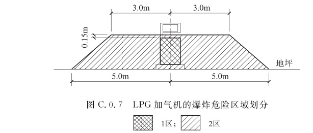 1 罐内部油品表面以上的空间应划分为0区; 2 以通气管管口为中心、半径为0.75m的球形空间和以密闭卸油口为中心、半径为0.5m的球形空间,以及加油机下箱体内部空间,应划分为1区; 3 以通气管管口为中心、半径为2.0m的球形空间和以密闭卸油口为中心、半径为1.5m的球形空间,以及以加油机中心线为中心线、以半径为3.0m的地面区域为底面和以加油机下箱体顶部以上0.15m、半径为1.5m的平面为顶面的圆台形空间,应划分为2区。C.0.7 LPG加气机的爆炸危险区域划分(图C.0.7)应符合下列规定: