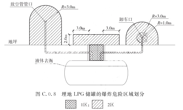 1 加气机内部空间应划分为1区; 2 以加气机中心线为中心线、以半径为5.0m的地面区域为底面和以加气机顶部以上0.15m、半径为3.0m的平面为顶面的圆台形空间,应划分为2区。C.0.8 埋地LPG储罐的爆炸危险区域划分(图C.0.8)应符合下列规定: