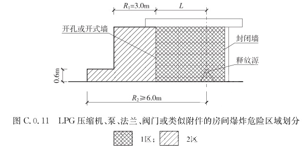 C.0.11 LPG压缩机、泵、法兰、阀门或类似附件的房间爆炸危险区域划分(图C.0.11)应符合下列规定: