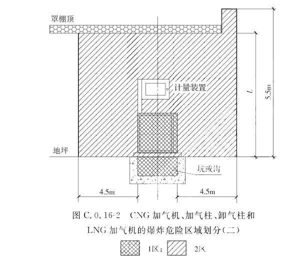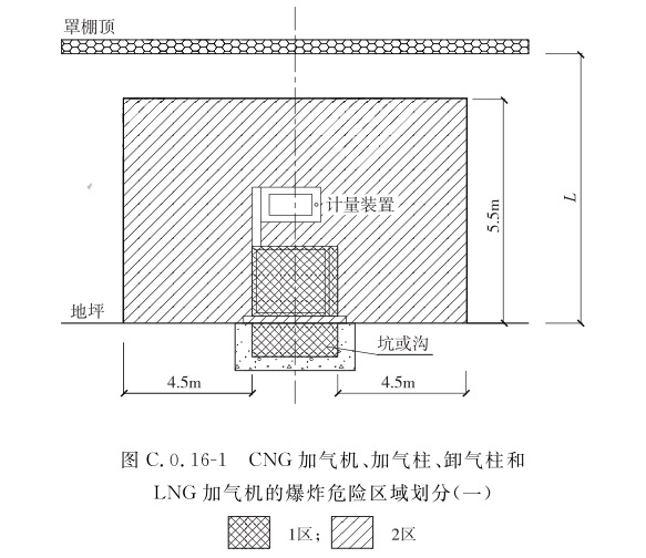 1 房间内部空间应划分为1区; 2 房间有孔、洞或开式外墙,距孔、洞或外墙开口边缘R的范围并延至地面的空间,应划分为2区。当1区边缘距释放源的距离L大于或等于1.5m时,R应取值为3.0m;当1区边缘距释放源的距离L小于1.5m时,R应取值为(4.5-L)m。C.0.16 CNG加气机、加气柱、卸气柱和LNG加气机的爆炸危险区域的等级和范围划分应符合下列规定: 1 CNG加气机、加气柱、卸气柱和LNG加机的内部空间应划分为1区。 2 距CNG加气机、加气柱、卸气柱和LNG加气机的外壁四周4.5m,自地面高度为5.5m的范围内空间应划分为2区(图C.0.16-1)。当罩棚底部至地面距离L小于5.5m时,罩棚上部空间应为非防爆区(图C.0.16-2)。