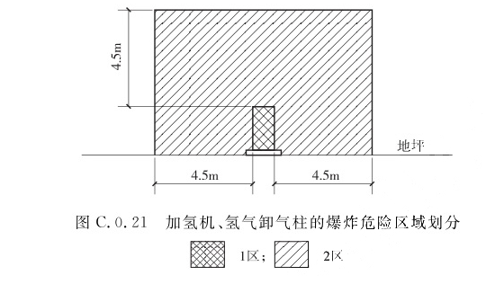 1 加氢机、氢气卸气柱内部全间,应划分为1区; 2 距加氢机、卸气柱外轮廓4.5m,并延至顶部以上4.5m的空间,应划分为2区。C.0.22 室外储氢容器的爆炸危险区域划分(图C.0.22),距设备外缘4.5m,并延至顶部以上4.5m的空间,应划分为2区。