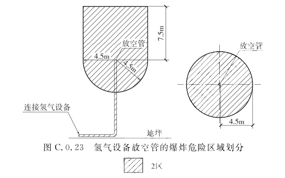 C.0.23 氢气设备放空管的爆炸危险区域划分(图C.0.23),以放空管管口为中心、半径为4.5m并延至顶部以上7.5m的空间,应划分为2区。