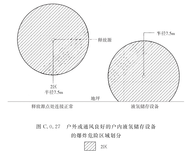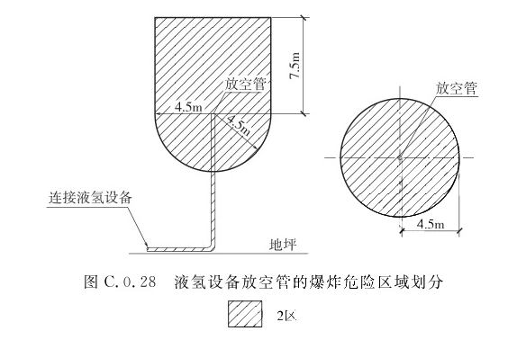1 释放源高于地面7.5m以上时,以释放源为中心、半径为7.5m的范围内,可划分为2区; 2 释放源与地坪的距离小于7.5m时,以释放源为中心、半径为7.5m并延至地坪的空间,可划分为2区。C.0.28 液氢设备放空管的爆炸危险区域划分(图C.0.28),以放空管管口为中心、半径为4.5m并延至顶部以上7.5m的空间,应划分为2区。