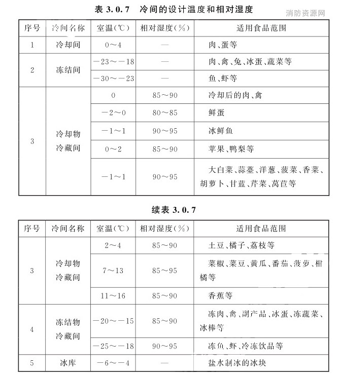 3.0.6 冷库设计的室外气象参数应符合现行国家标准《工业建筑供暖通风与空气调节设计规范》GB50019的有关规定。3.0.7 冷间的设计温度和和对湿度应根据各类食品的冷藏工艺要求确定,也可按表3.07的规定选用。温度波动范围应根据各类食品的冷藏工艺要求确定;当冷藏工艺没有明确要求时,冷却物冷藏间温度波动范围不宜超过±1℃,冻结物冷藏间温度波动范围不宜超过±150℃。