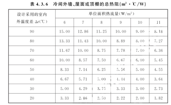 4.3.7 冷间隔墙总热阻可根据镉墙两侧设计室温接表4.3.7的规定选用。
