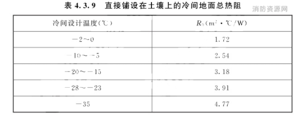 注:1 楼板总热阻已考虑生产中温度波动因素。 2 当冷却物冷藏间楼板下为冻结物冷藏间时,楼板热阻不宜小于4.08㎡·℃/W。4.3.9 直接铺设在土壤上的冷间地面总热阻可根据冷间设计温度按表4.3.9的规定选用。