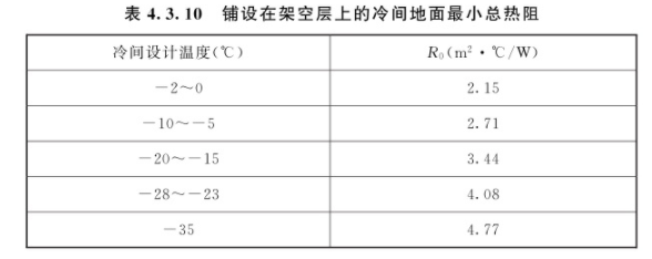 4.3.10 铺设在架空层上的冷间地面最小总热阻应符合表4.3.10的规定。