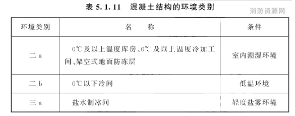 注:当有充分依据或可靠措施时,表中数值可适当增加。5.1.7 当冷间阁楼屋面采用现浇钢筋混凝土楼盖,且相对边柱中心线距离大于或等于30m时,边柱柱顶与屋面梁宜采用铰接。5.1.8 当冷间底层为现浇钢筋混凝土架空地面时,架空层净高宜满足施工要求,当采用地垄墙架空时,地面结构宜采用混凝土预制梁板。5.1.9 当库房外墙采用自承重砌体墙时,外墙与库内承重结构之间每层均应设置可靠拉结并采取防冷桥措施,且库房外墙应有可靠的防裂构造措施。5.1.10 处于低温环境下的库房墙砌体应有可靠的防裂措施。5.1.11 冷间混凝土结构的环境类别应符合表5.1.11的规定。