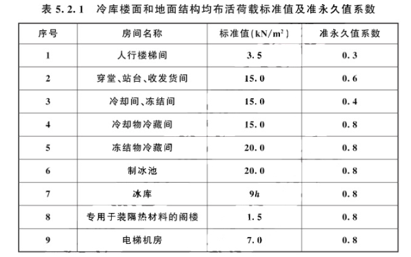 5.2.1 直接码垛货物的冷库楼面和地面结构均布活荷载标准值及准永久值系数的取值,应根据房间用途按表5.2.1的规定采用。