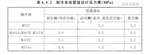 6.5.1 制冷管道系统设计应符合现行国家标准《工业金属管道设计规范》GB50316、《压力管道规范工业管道》GB/T20801和《压力管道安全技术监察规程——工业管道》TSGD0001的有关规定。6.5.2 氨、卤代烃及其混合物制冷系统管道的设计压力应根据当地夏季空调室外计算干球温度和工作压力计算确定,高压侧设计压力不应小于冷凝温度加5℃所对应的制冷剂饱和压力及当地夏季空调室外计算干球温度加5℃所对应的制冷剂饱和压力中的最大值,低压侧设计压力不应小于当地夏季空调室外计算干球温度加5℃所对应的制冷剂饱和压力及最高工作压力加循环泵扬程中的最大值,并且制冷系统管道设计压力不应小于表6.5.2内规定的压力值。