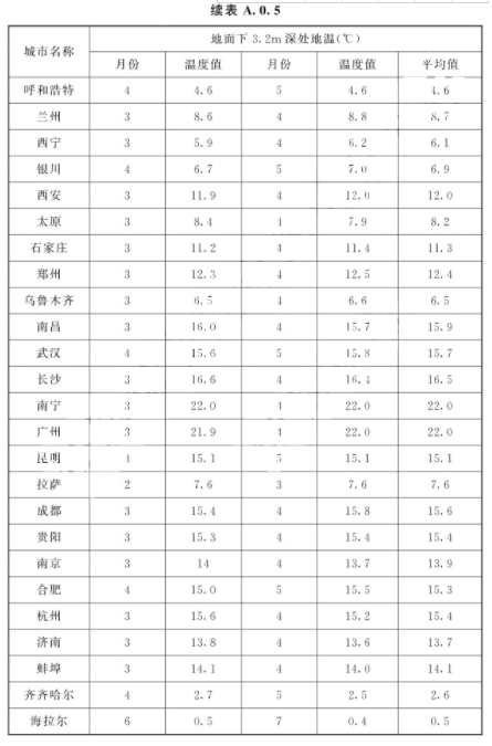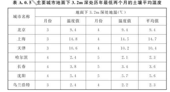 tr——地面加热层的温度(℃),宜取1℃~2℃。 Ktu——土壤传热系数[W/(㎡·℃)]。A.0.5 土壤温度取地面下3.2m深处历年最低两个月的土壤平均温度,应按表A.0.5的规定确定。当缺少该项资料时,可按当地年平均气温减2℃计算。