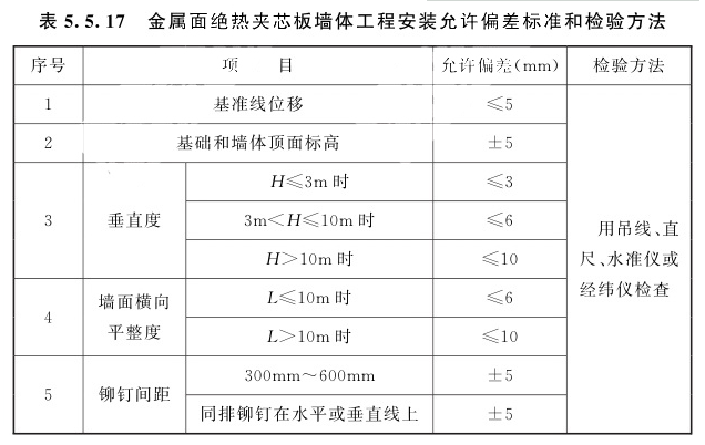 5.5.1 金属面绝热夹芯板保温系统可由支撑固定结构、夹芯板、紧固件、密封材料、辅件等组成。5.5.2 金属面绝热夹芯板性能应符合设计要求和国家现行标准《组合冷库用隔热夹芯板》JB/T6527、《建筑用金属面绝热夹芯板》GB/T23932的有关规定。进入施工现场的金属面绝热夹芯板应检查出厂合格证、质量检验报告和进场检验报告。5.5.3 金属面绝热夹芯板的厚度应符合设计要求,可采用尺量检查进行检验;厚度小于或等于100mm时,允许偏差为±1mm;厚度大于100mm时,允许偏差为±2mm。5.5.4 金属面绝热夹芯板安装前,施工单位应按施工图纸的要求和该项目的施工组织设计要求,编写具体详细的施工方案,施工方案应包含夹芯板排板布置图,固定夹芯板的支撑固定结构布置图。5.5.5 现场存放的夹芯板应有防火、防风、防雨水措施,并应远离热源、火源。5.5.6 金属面绝热夹芯板、紧固件及辅件与基础、主体结构的连接应符合设计要求,金属面绝热夹芯板端头与基础、主体结构连接的外露保温芯材的隔汽应符合设计要求,并应注意各构件连接的观感质量。5.5.7 金属面绝热夹芯板横向拼接的槽企口内不应有明显的缝隙,拼接板缝应在槽企口内涂抹密封胶,并应利用紧固工具挤紧板缝;在板顺向的连接处,应预留不小于20mm的缝隙,两端夹芯板应各自固定牢固,应缝内灌制聚氨酯并应采用辅件密封封盖。5.5.8 金属面绝热夹芯板的拼接缝应平整密实,与相接的夹芯板墙面应保持顺平竖直,应按设计要求在连接处预留空隙空间内灌制聚氨酯并应采用辅件密封封盖。连接处不得出现明显凹陷,内外包角边连接后不得出现波浪形翘曲。5.5.9 金属面绝热夹芯板与主体结构的固定应采用紧固件。当使用螺栓连接时,可采用普通扳手紧固,螺栓连接后外露丝扣不应小于2扣,连接紧固点处夹芯板表面不应出现凹陷。螺栓紧固应在螺母与夹芯板间设置钢垫圈,并宜加设橡胶垫片增加隔汽功能。5.5.10 金属面绝热夹芯板安装时应随时检查墙面的平整度,未达到要求应立即进行重做调整。5.5.11 金属面绝热夹芯板的拼接或插接应平整,板缝应均匀、严密,板缝表面均应按设计要求涂抹密封胶。5.5.12 金属面绝热夹芯板上安装吊挂件时,应符合设计要求,并应与主体结构相连,不得仅与夹芯板表面金属板固定。5.5.13 金属面绝热夹芯板上穿孔安装吊挂件时,应符合设计要求,并应注意做好防冷桥处理。5.5.14 金属面绝热夹芯板上线槽、接线盒应采用不燃材料且明装,应与夹芯板的面板连接牢固,并应符合设计要求和本标准第7.1节的有关规定。5.5.15 金属面绝热夹芯板验收的主控项目检验内容,应符合下列规定: 1 夹芯板的安装位置及排板布置应符合设计要求; 2 夹芯板与主体结构之间的连接应牢固、稳定,连接方法应符合设计要求; 3 夹芯板板缝表面应涂抹密封胶;夹芯板安装所用密封材料的品种及密封方法应符合设计要求; 4 夹芯板顺向连接预留缝隙及转角连接处预留空隙空间等处应灌制聚氨酯,且不得有空腔现象; 5 穿越夹芯板的结构构件、金属管道,当夹芯板两侧有温差时,隔断冷桥的处理措施应符合设计要求。5.5.16 金属面绝热夹芯板验收的一般项目检验内容,应符合下列规定: 1 夹芯板安装应垂直、平整、位置正确,转角应规整,板面清洁,并应无胶痕、油污,无明显划痕、磕碰、伤痕; 2 夹芯板工程外观应平整、光滑、色泽一致,接缝应顺直; 3 夹芯板上所开的孔洞、槽、盒等应位置准确、切割方正、边缘整齐; 4 夹芯板板缝表面应涂抹密封胶应均匀美观;夹芯板表面压条应平直、接口严密、安装牢固。5.5.17 金属面绝热夹芯板墙体工程安装允许偏差标准和检验方法应按表5.5.17中的规定执行。