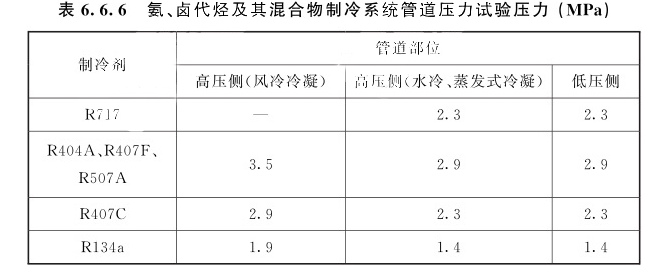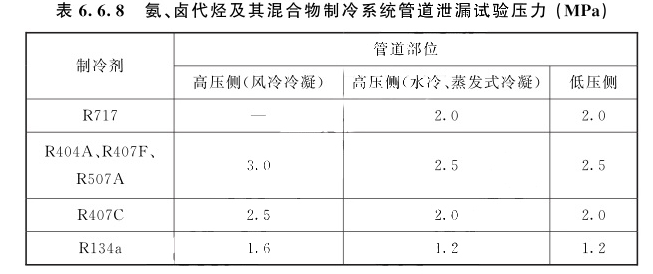 2 与热气融霜有关的管道应为5.9MPa。6.6.8 制冷系统和二氧化碳载冷系统泄漏试验压力应符合设计文件的要求及国家现行标准《压力管道安全技术监察规程——工业管道》TSGD0001和《压力管道规范 工业管道 第5部分:检验与试验》GB/T20801.5的有关规定,氨、卤代烃及其混合物制冷系统管道泄漏试验压力不应小于表6.6.8内的压力值。
