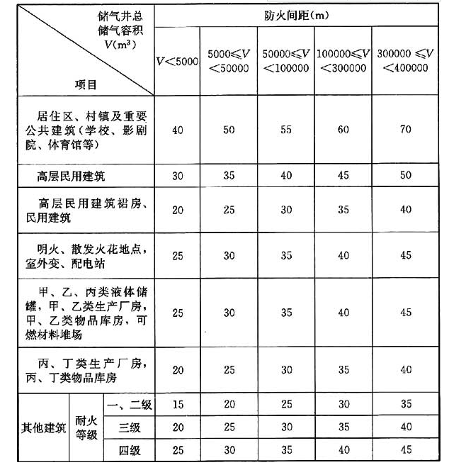注:1 储气井总储气容积按储气井几何容积(m³)与最高储气压力(绝对压力,102kPa)乘积并除以压缩因子后的总和计算。2 居住区、村镇指居住1000人或300户以上的地区。高层建筑达到居住区规模时,应按居住区对待。