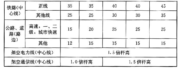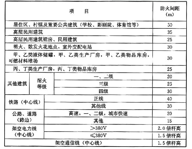 注:1 居住区、村镇指居住1000人或300户以上的地区。高层建筑达到居住区规模时,应按居住区对待。2 室外变、配电站指电力系统电压为35kV~500kV,且每台变压器容量在10MV·A以上的室外变、配电站,以及工业企业的变压器总油量大于5t的室外降压变电站。低于上述规格的室外变、配电站或变压器可按丙类生产厂房对待。