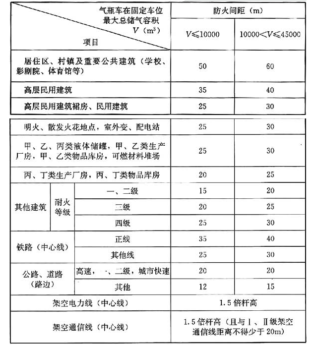 注:1 气瓶车在固定车位最大总储气容积按在固定车位各气瓶车的几何容积(m³)与最高储气压力(绝对压力,102kPa)乘积并除以压缩因子后的总和计算。2 居住区、村镇指居住1000人或300户以上的地区。高层建筑达到居住区规模时,应按居住区对待。