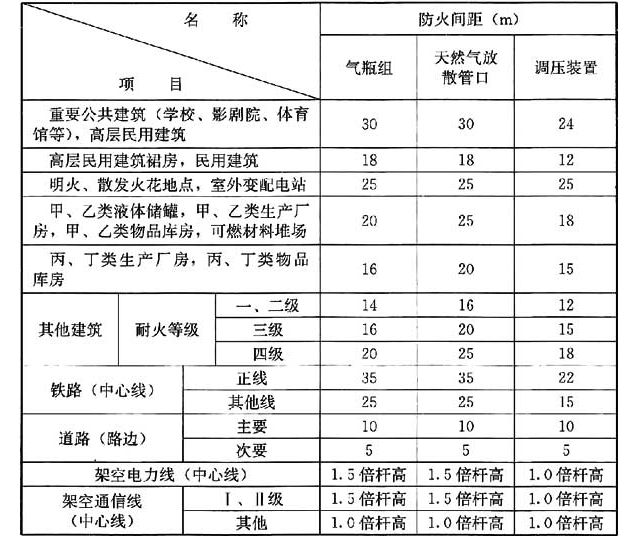 4.2.6 压缩天然气瓶组供气站内的气瓶组应设置在固定地点。气瓶组、天然气放散管口及调压装置与站外建(构)筑物的防火间距不应小于表4.2.6的规定。表4.2.6 气瓶组、天然气放散管口及调压装置与站外建(构)筑物的防火间距