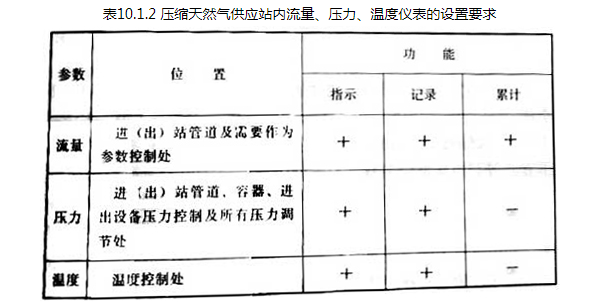 注:表中“+”表示应设置,“—”表示没有要求设置。10.1.3 压缩天然气加气站、压缩天然气储配站内应根据需要设置测定燃气组分、发热量、密度、含水量、含硫量及其他有害杂质含量的仪器、仪表。
