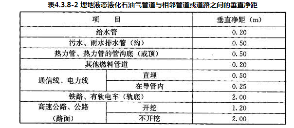 4.3.8 埋地液态液化石油气管道与建筑或相邻管道等之间的水平净距不应小于表4.3.8-1的规定;埋地管道与相邻管道或道路之间的垂直净距不应小于表4.3.8-2的规定。