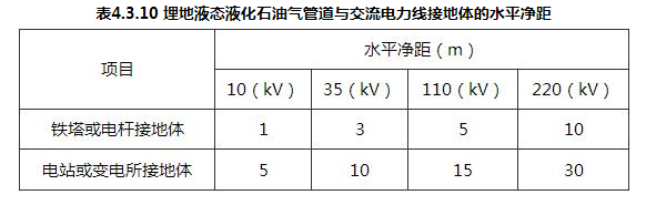 4.3.10 埋地液态液化石油气管道与交流电力线接地体的水平净距不应小于表4.3.10的规定。