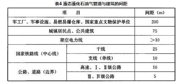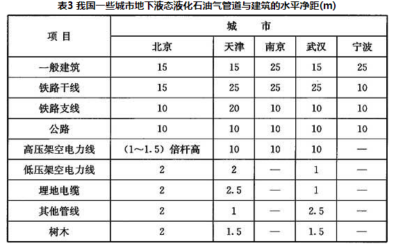1)国内现状。我国一些城市敷设的地下液态液化石油气管道与建筑的水平净距见表3。