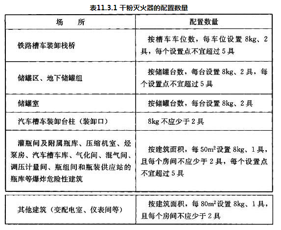 11.3.1 液化石油气供应站内干粉灭火器或CO2灭火器的配置应符合现行国家标准《建筑灭火器配置设计规范》GB 50140的有关规定。干粉灭火器的配置数量应符合表11.3.1的规定。