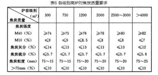 原料煤中60%~70%的硫残留在焦炭中,焦炭硫含量高,在高炉炼铁时,易使生铁变脆,降低生铁质量。所以规定煤中硫含量应小于1%(对1000~4000m³高炉应为0.6%~0.8%,对大于4000m³高炉应小于0.6%)。原料煤的粒度,决定装炉煤的堆积密度,装炉煤的堆积密度越大,焦炭的质量越好,但原料煤粉碎得过细或过粗都会使煤的堆积密度变化。因此本条文根据实际生产经验总结规定炼焦装炉煤粒度小于3mm的含量为75%~80%。各级别高炉对焦炭质量要求见表6(重庆钢铁设计院编制的“炼铁工艺设计技术规定”)。