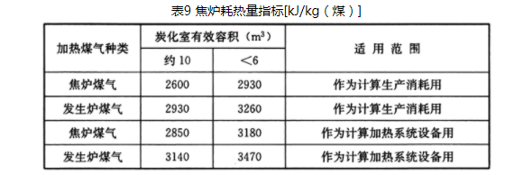 煤干馏炉的加热煤气的耗热量指标是一项综合性的指标。焦炉的耗热量指标是按鞍山焦耐院多年来的经验总结资料制定的。对炭化室有效容积大于20m³的焦炉。用焦炉煤气加热时规定耗热量指标为2340kJ/kg。而根据实测数据,当焦炉的均匀系数和安定系数均在0.95以上时,3个月平均耗热量为2260kJ/kg;当全年的均匀系数和安定系数均在0.90以上时,耗热量为2350kJ/kg。这说明本条规定的指标是符合实际情况的。