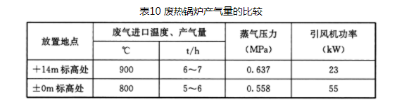 4.2.17 废热锅炉的设置地点与锅炉的出力有很大关系。同样形式的两台废热锅炉由于安装高度不一样,结果在产气量上有明显差别(见表10)。