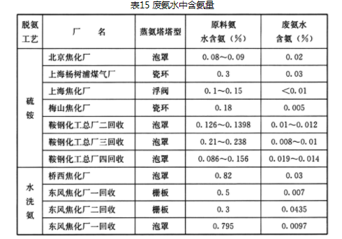 废氨水中含氨量的规定是按照既要尽可能多回收氨,又要合理使用蒸汽,而且还应能达到此项指标的要求等项原则而制定的。表15列举各厂蒸氨后的废氨水中含氨量。