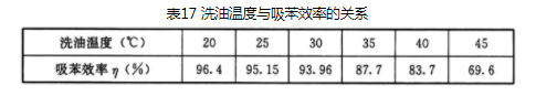 5.7.2 终冷器出口煤气温度的高低,是决定煤气中萘在终冷器内净化和粗苯在洗涤塔内被吸收的效果的极重要因素。苯的脱除与煤气出终冷器的温度有关。其温度越低,终冷后煤气中苯含量就越少。而对粗苯而言,煤气温度越高,吸收效率越差。由于吸苯洗油温度与煤气温度差是一定值,在表17洗油温度与吸苯效率关系中反映了终冷后煤气温度高低对吸苯效率的影响。