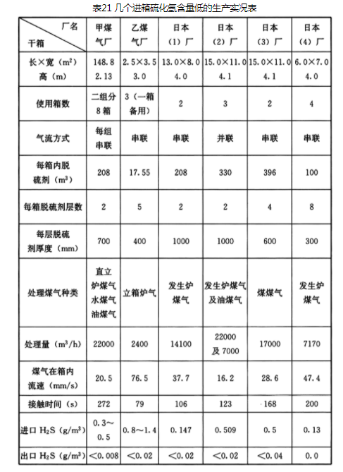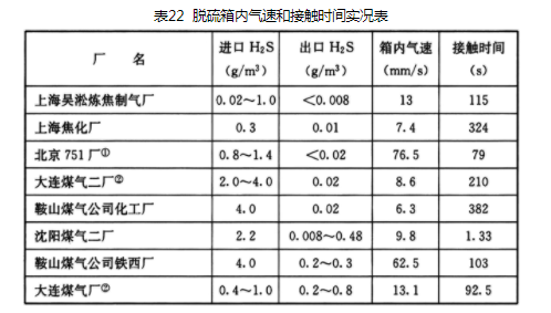 当处理的煤气中硫化氢含量低于1g/m³时,如仍采用7~11mm/s就过于保守了,事实上无论国内与国外的实践证明,当硫化氢含量较低时可以适当提高流速而不影响脱硫效率,如日本的4个煤气厂箱内流速分别为16.2mm/s、28.6mm/s、37.7mm/s、47.4mm/s,上海杨树浦煤气厂箱内流速为20.5mm/s(见表21)。