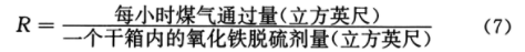 以上四个公式比较,米特和爱佛里公式较粗糙,而且不考虑煤气中H2S含量的变化,故不宜推荐,斯蒂尔公式虽在S校正系数中考虑了H2S的变化,但S值仅是H2S在4.5~23g/m³间才适用,对干法脱硫箱常用的低H2S值时就不能适用了,经过一系列公式演算和实际情况对照认为密尔本公式较为适宜。按《焦炉气及其他可燃气体的脱硫》一书说明,密尔本公式只适用于H2S含量小于0.8%体积比(相当于12g/m³左右),这符合一般人工煤气的范围。
