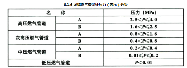 6.1.6 城镇燃气管的设计压力(P)分为7级,并应符合表6.1.6的要求。