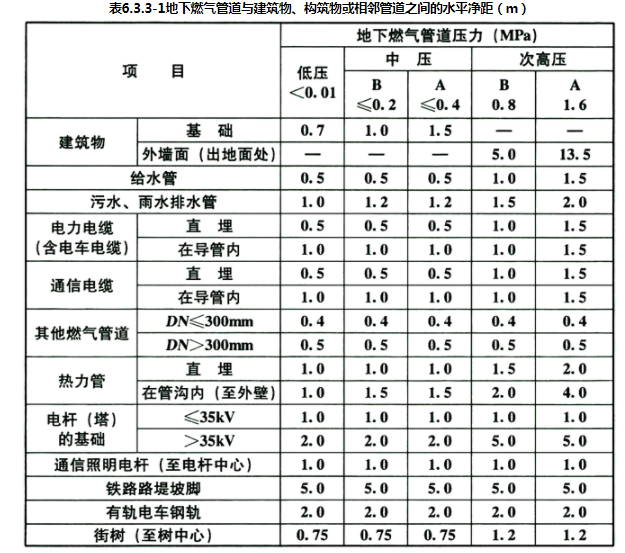 地下燃气管道与建筑物、构筑物或相邻管道之间的水平和垂直净距,不应小于表6.3.3-1 和表6.3.3-2的规定。