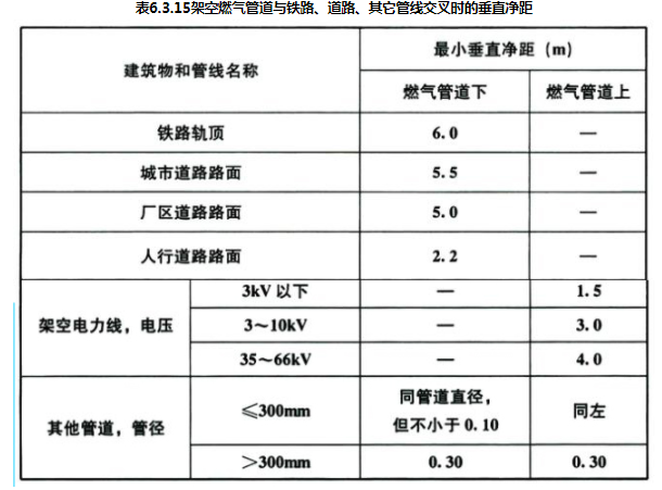 3 架空燃气管道与铁路、道路、其它管线交叉时的垂直净距不应小于表6.3.15的规定。