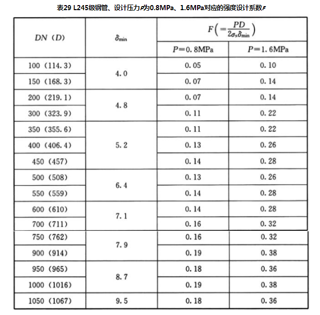 最小公称壁厚是考虑满足管道在搬运和挖沟过程中所需的刚度和强度要求,这是参照钢管标准和有关国内外标准确定的,并且该厚度能满足在输送压力0.8MPa,强度系数不大于0.3时的计算厚度要求。例如在设计压力为0.8MPa,选用L245级钢管时,对应DN100~1050最小公称壁厚的强度设计系数为0.05~0.19。详见表29。