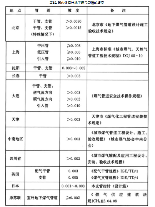 6.3.5规定燃气管道敷设于冻土层以下,是防止燃气中冷凝液被冻结堵塞管道,影响正常供应。但在燃气中有些是干气,如长输的天然气等,故只限于湿气时才须敷设在冻土层以下。但管道敷设在地下水位高于输气管道敷设高度的地区时,无论是对湿气还是干气,都应考虑地下水从管道不严密处或施工时灌入的可能,故为防止地下水在管内积聚也应敷设有坡度,使水容易排除。为了排除管内燃气冷凝水,要求管道保持一定的坡度。国内外有关燃气管道坡度的规定如表31,地下燃气管道的坡度国内外一般所采用的数值大部分都不小于0.003。但在很多旧城市中的地下管一般都比较密集,往往有时无法按规定坡度敷设,在这种情况下允许局部管段坡度采取小于0.003的数值,故本条规范用词为“不宜”。