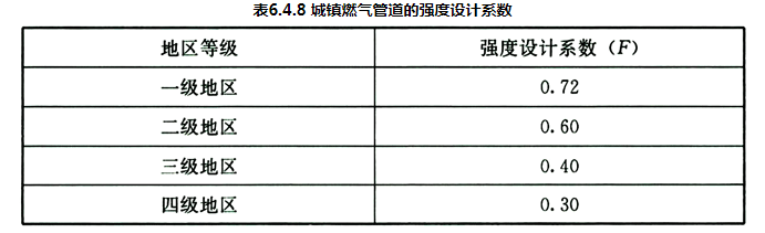 6.4.8 城镇燃气管道的强度设计系数(F)应符合表6.4.8的规定。