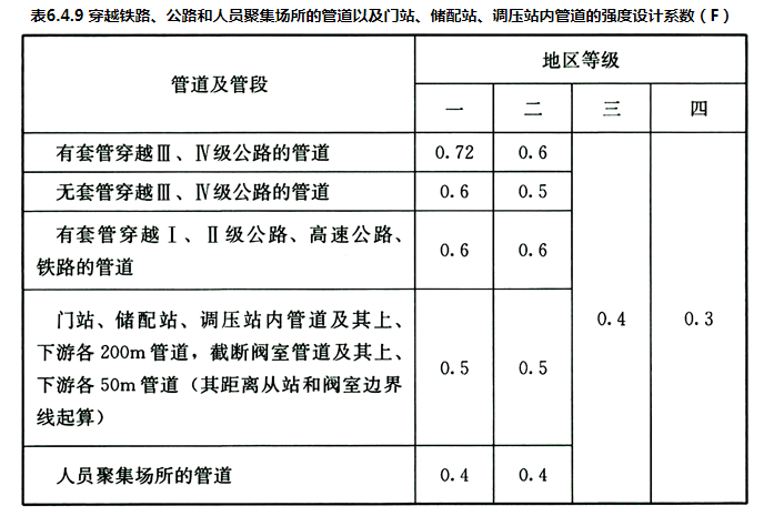 6.4.9 穿越铁路、公路和人员聚集场所的管道以及门站、储配站、调压站内管道的强度设计系数,应符合表6.4.9的规定。