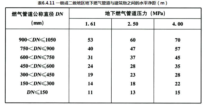 6.4.11、6.4.12 关于地下燃气管道到建筑物的水平净距。