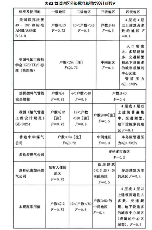 几个国家和地区管道地区分级标准和强度设计系数F详见表32。