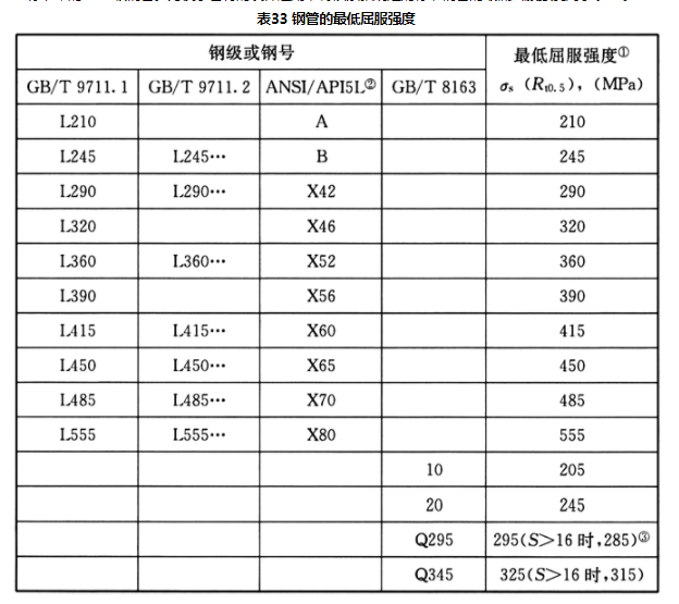 2 钢管标准《石油天然气工业输送钢管交货技术条件第1部分:A级钢管》GB/T9711.1中L175级钢管有三种与相应制造工艺对应的钢管:无缝钢管、连续炉焊钢管和电阻焊钢管。其中连续炉焊钢管因其焊缝不进行无损检测,其焊缝系数仅为0.6,并考虑到175级钢管强度较低,不适用于高压燃气管道,因此规定高压燃气管道材料不应选用GB/T 9711.1标准中的L175级钢管。为便于管材的设计选用,将该条款规定的标准钢管的最低屈服强度列于表33。